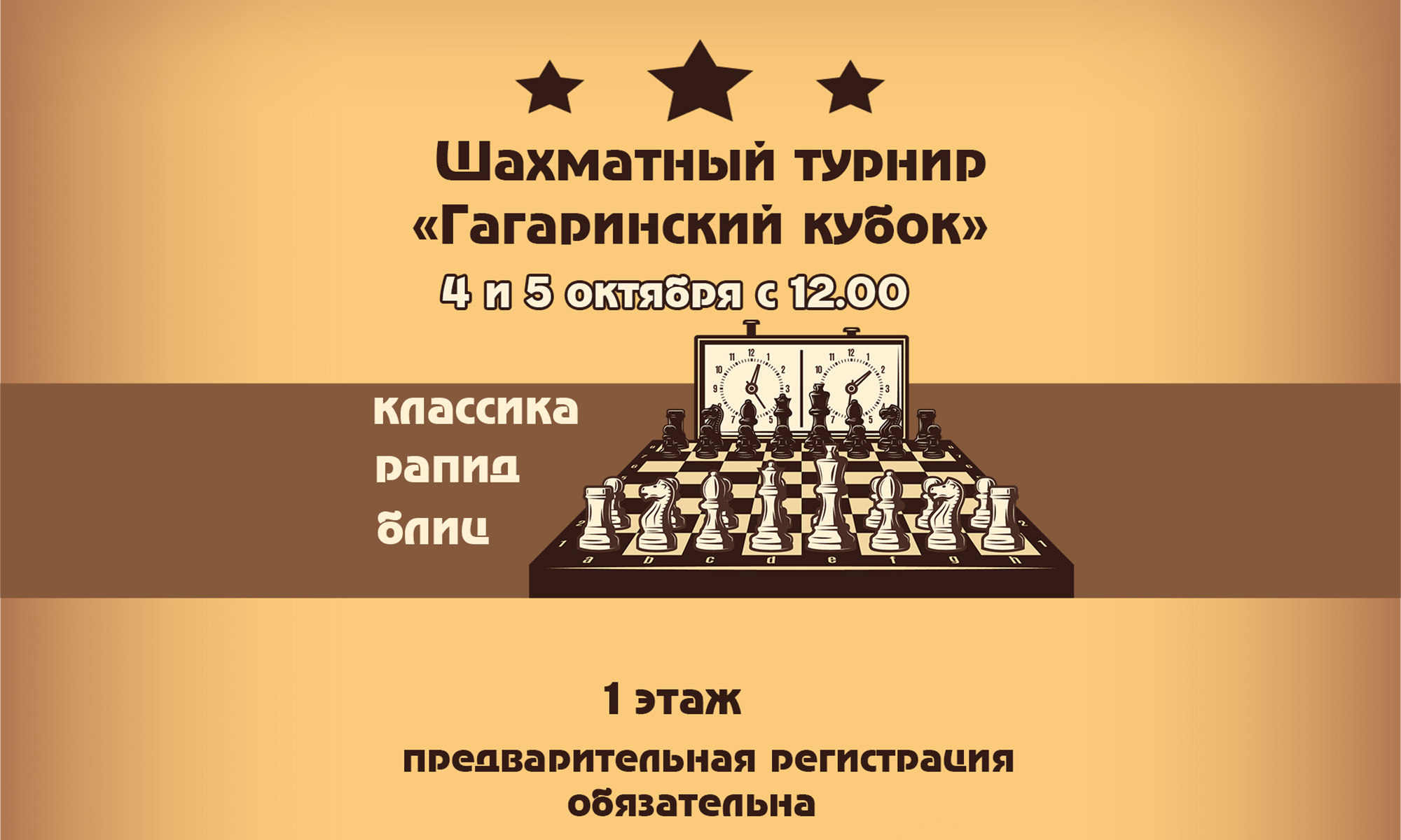 4 и 5 октября (выходные) в ТРЦ «Гагаринский» состоятся турниры по классическим и быстрым шахматам. В турнирах смогут принять участие игроки различного возраста и с различным уровнем игры.